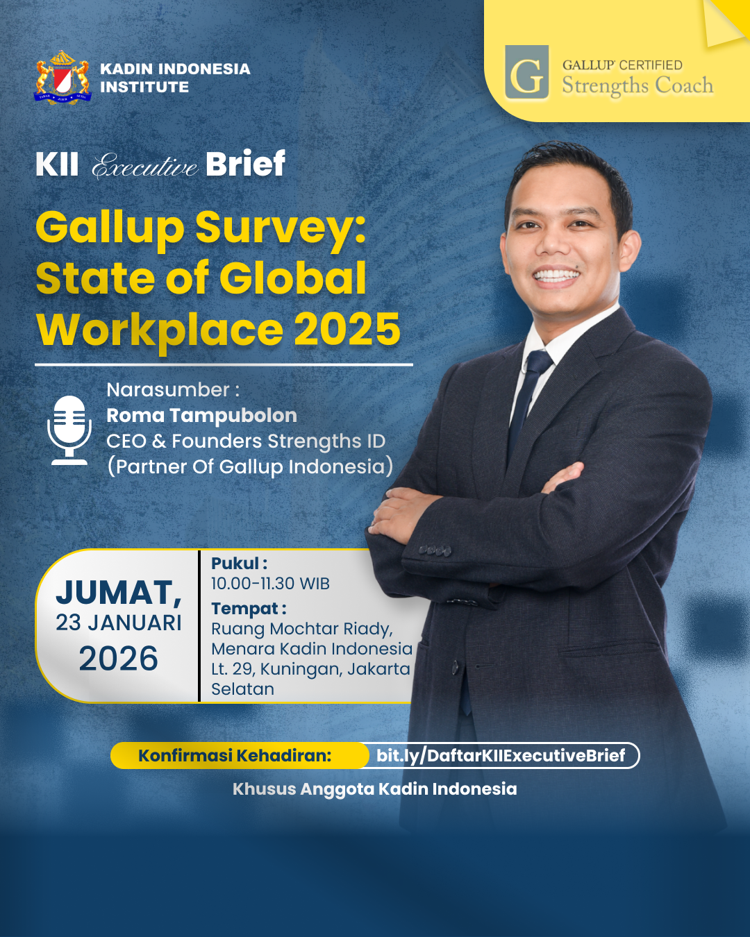 Melalui KII Executive Brief, Roma Tampubolon, CEO & Founder Strengths ID (Partner of Gallup Indonesia), akan membahas temuan utama Gallup Survey serta implikasinya bagi pemimpin dan dunia usaha dalam membangun organisasi yang produktif, adaptif, dan berkelanjutan.