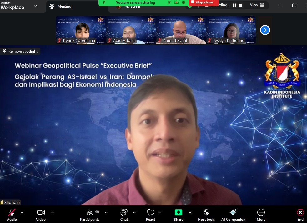 Jakarta, 12 Maret 2026 — KADIN Indonesia Institute menyelenggarakan webinar bertajuk “Geopolitical Pulse: Executive Brief – Gejolak Perang AS–Israel vs Iran: Dampak dan Implikasi bagi Ekonomi Indonesia” pada Kamis (12/3). Kegiatan yang berlangsung secara daring melalui Zoom ini menghadirkan para pakar untuk membahas dinamika geopolitik terbaru di Timur Tengah serta implikasinya terhadap ekonomi global dan Indonesia.